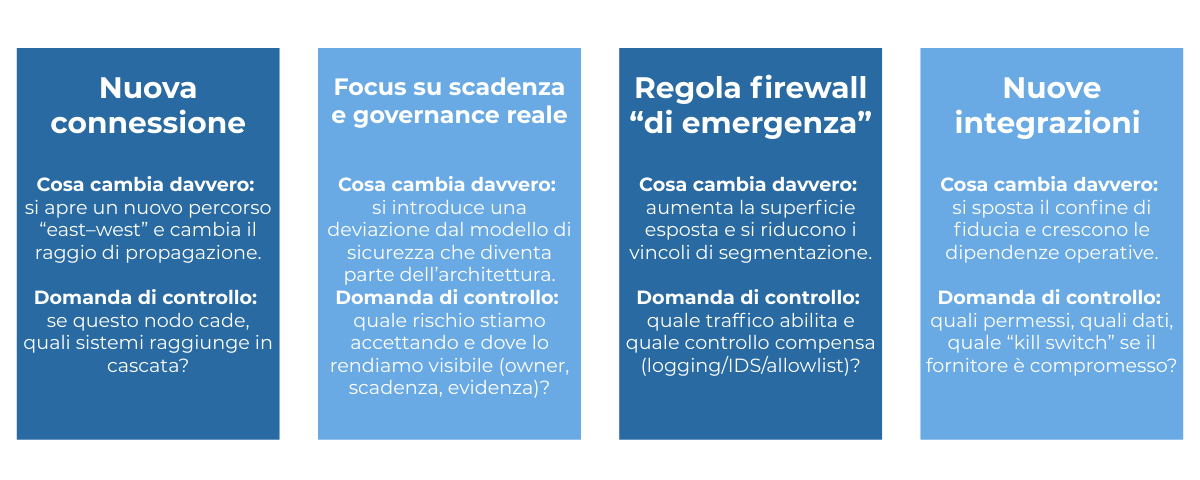 In questo scenario il rischio non si manifesta più solo in presenza di un attacco esplicito, ma può cambiare ogni volta che l’organizzazione modifica un qualsiasi parametro del proprio assetto operativo. Scelte tecniche spesso legittime, introdotte per rispondere a esigenze immediate, possono alterare l’esposizione senza produrre segnali evidenti. Il rischio può così nascere da qualsiasi movimento interno all’organizzazione, non esclusivamente dall’azione di un avversario esterno.