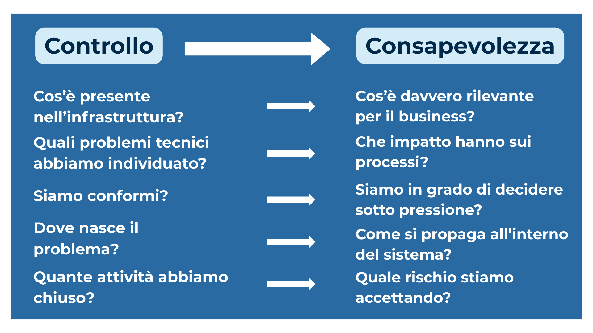 Chi governa un’azienda non cerca un elenco di vulnerabilità o lo stato di avanzamento di un piano di patching, ma una comprensione chiara dell’esposizione assunta e delle conseguenze delle scelte in corso.